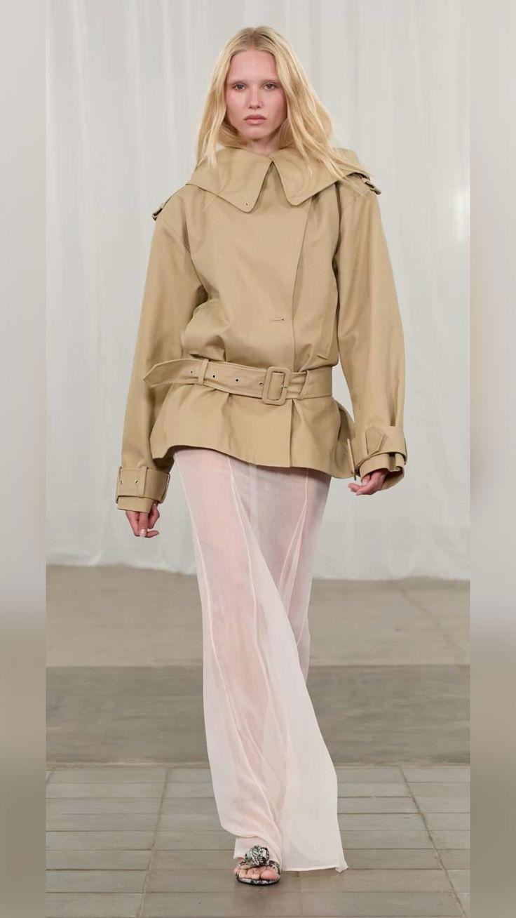 Подіум: Prabal Gurung, Altuzarra SS26 – тренч із заниженою талією і плавними лініями.