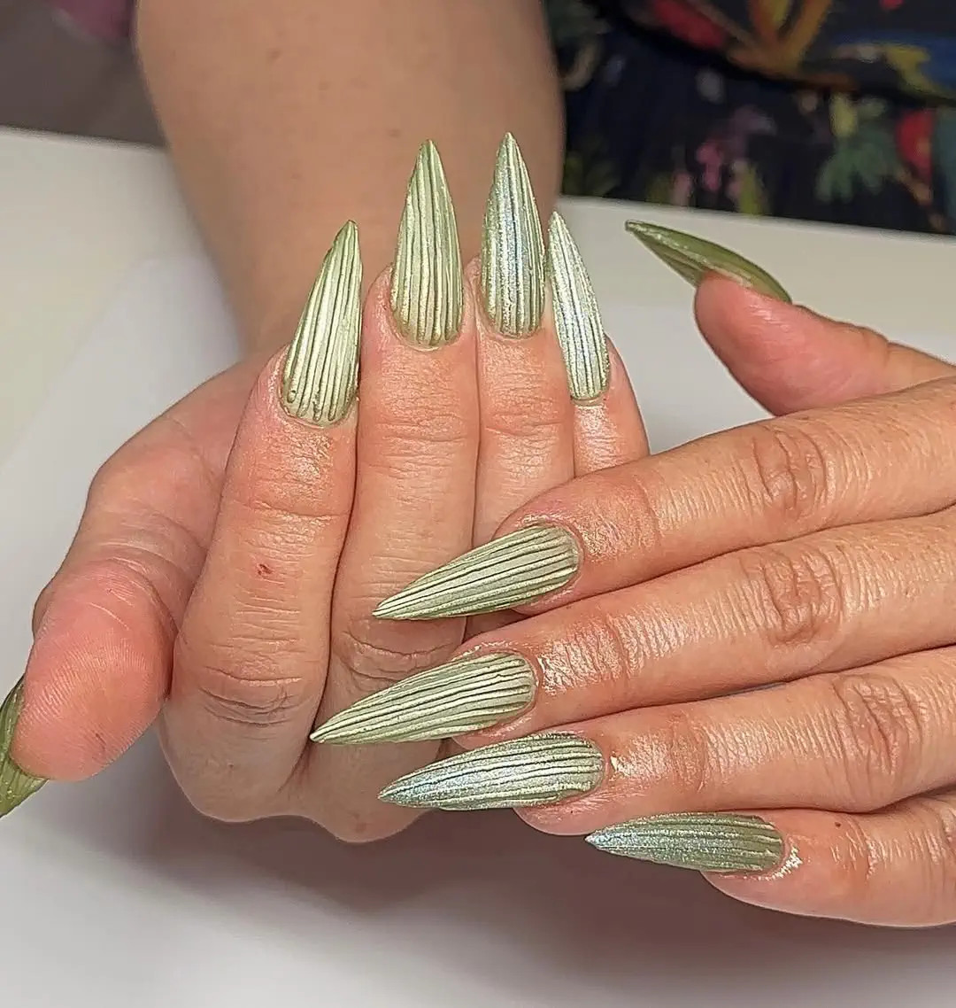 По суті, це об’ємний 3D-дизайн нігтів із вертикальними лініями, створеними поверх гелю з ефектом «котяче око» або іншого мерехтливого покриття. Усередині – глибина і магнітне сяйво, яке рухається разом із твоєю рукою. Зверху – глянсові ребра, що ловлять світло окремо, підкреслюючи кожен рух. У результаті нігті виглядають не просто нафарбованими, а ніби вирізьбленими зі скла.