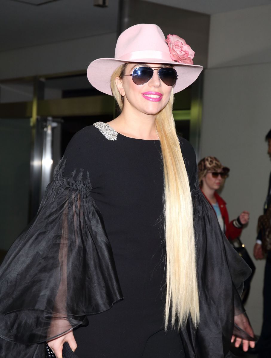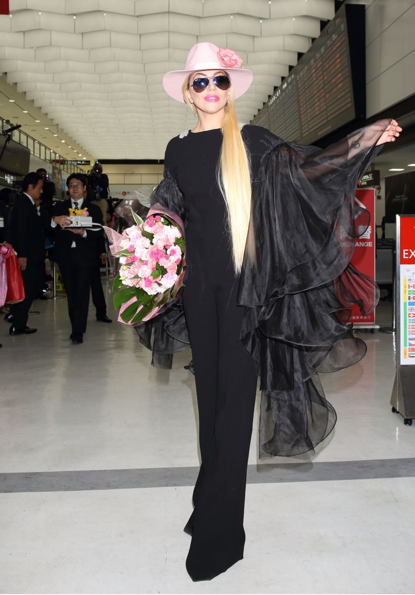 Для появления на публике Леди Гага выбрала весьма экстравагантный комбинезон черного цвета. Рукава костюма были разклешенными и сделаны из органзы. Образ певица дополнила необычной шляпой розового цвета с цветком.