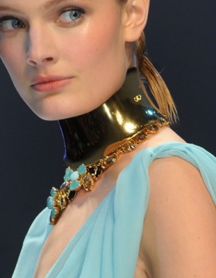 Второй тренд: кожа питона и крокодила, из этих материалов были выполнены клатчи в коллекции Armani Prive и Jean Paul Gaultier. Если говорить об украшениях, то тут все не так однозначно: изысканные серьги-подвески у Chanel, "змеиные" колье и кольца у Armani, футуристичные браслеты Julien Fournie и этнические украшения у Готье, - словом, на любой вкус.