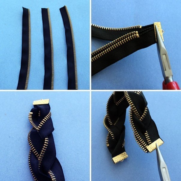 Тебе понадобятся 3 одинаковых полоски из молнии. Соедини из зажимом с одной стороны, заплети в косичку и соедини зажимом с другой. Прицепи замочек - браслет готов!