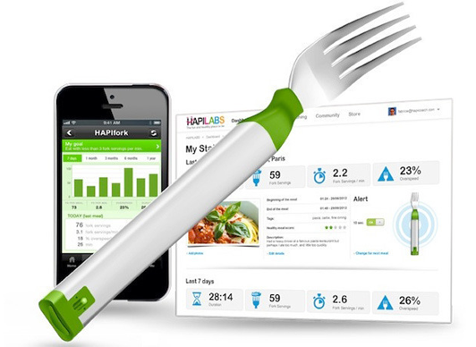 Вилка HAPIfork выглядит словно игрушечная, но идет с батарейками, оснащена bluetooth и встроенным датчиком. Если не проходит как минимум 10-ти секунд от начала пережевывания еды и следующим укусом, то вилка начинает вибрировать, как электронная зубная щетка. Этот сигнал означает, что нужно сбавить темп. А если ты будешь оставлять хорошие паузы, то получишь поощрительное сообщение на свой телефон.