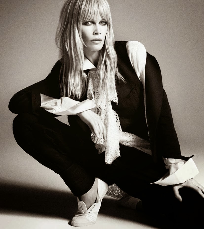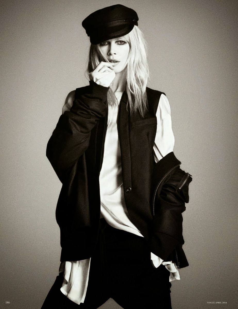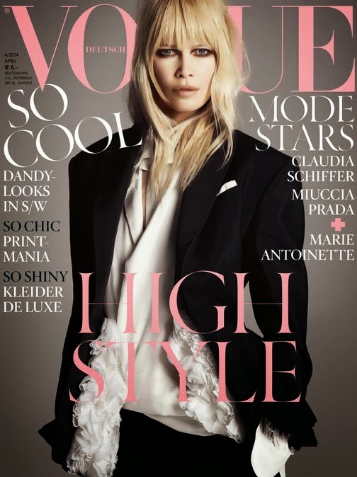 Супермодель Клаудия Шиффер появилась на обложке апрельского номера журнала Vogue Германия. Для фотосессии стилисты подобрали лаконичные костюмы, которые словно были сняты с мужского плеча. Стоит отметить, что подобные наряды еще больше подчеркивают нежность и хрупкость Клаудии Шиффер.